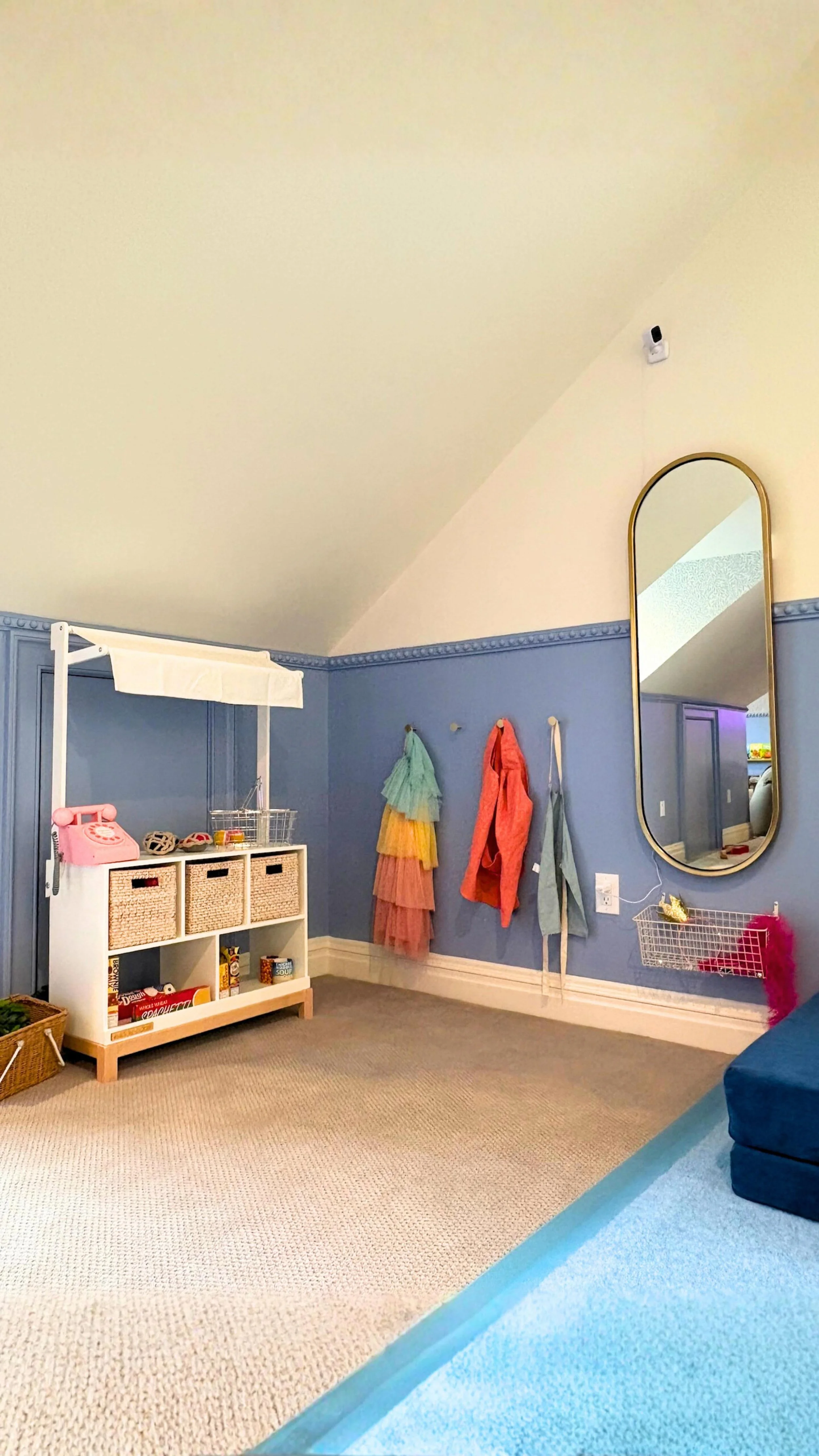 Designing for different age groups requires an understanding of their developmental milestones and interests. However, the foundation of the playroom like an, art space, active space, fort, or small hangout nook are all interesting to kids of all ages. The structure doesn’t change but the products and materials change as your kids mature and gain new skills!