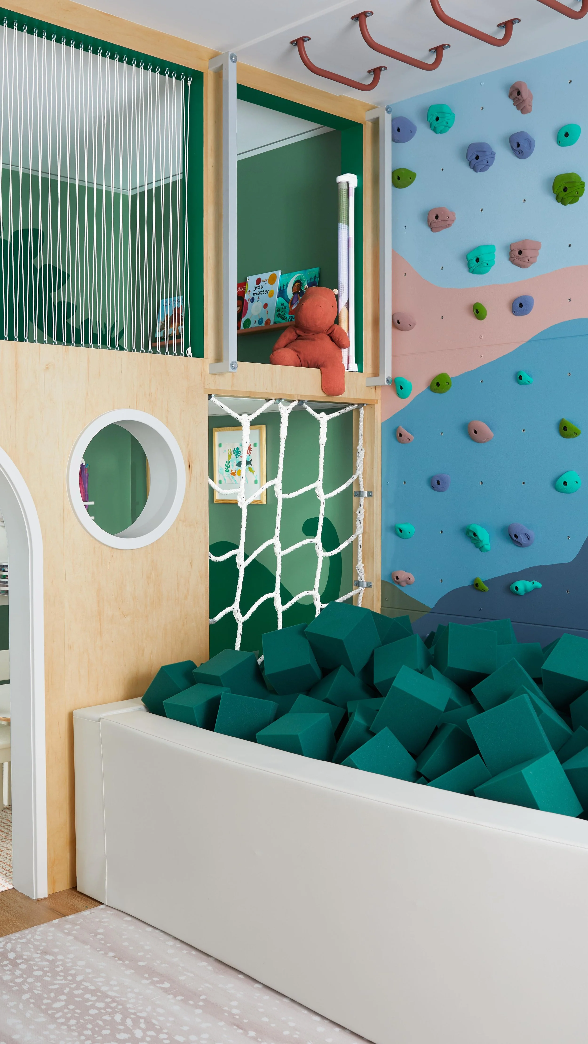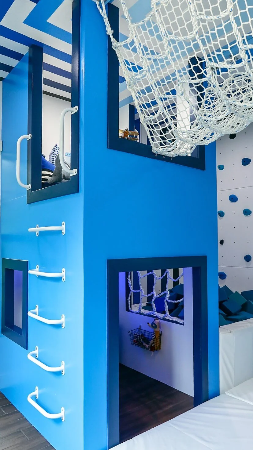 This space was designed for growing kiddos with lots of energy: physical and creative! With grOH's gross motor gym, they are bouldering MVPs and superstar ninja warriors in the making. A budding lyricist is now equipped to write and record to their heart's content in their own private recording studio. A LEGO aficionado now has ample space to build and dream. This family went from never using their basement to never wanting to leave it!